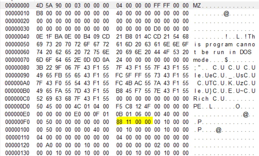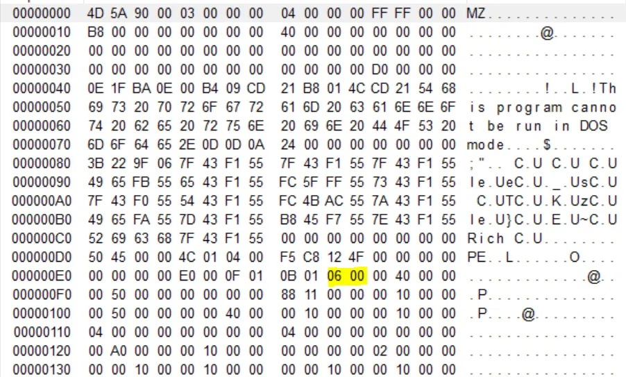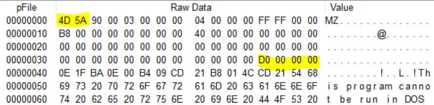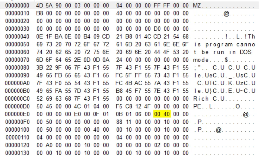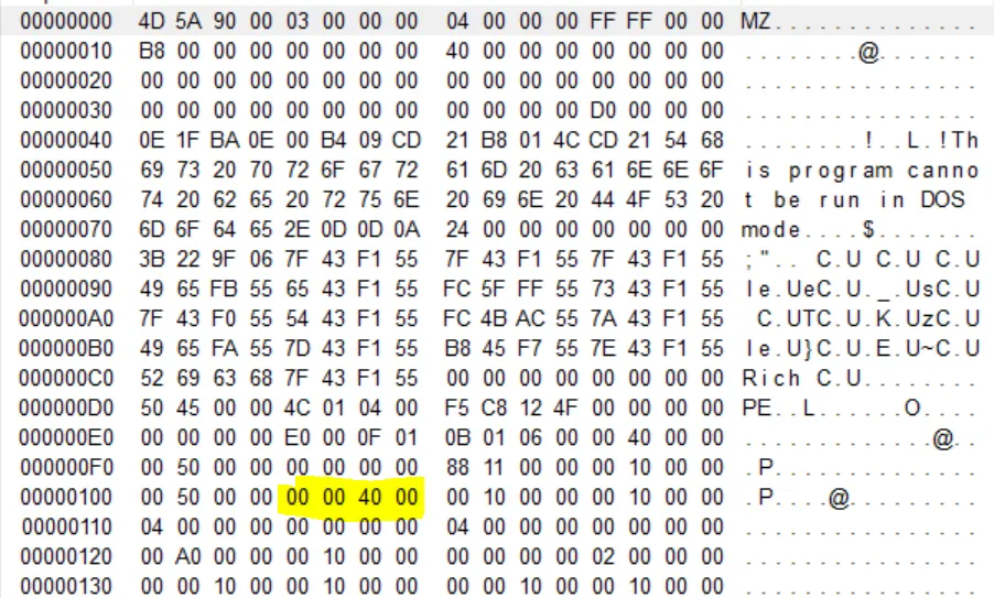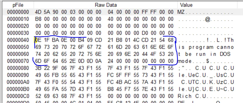 파란색으로 칠한 부분이 DOS stub이며 문자열 부분을 보면 This is program cannot be run in DOS mode 라고 써져있다. 해당 프로그램은 DOS 모드에서 실행할 수 없다는것을 말하고 있다