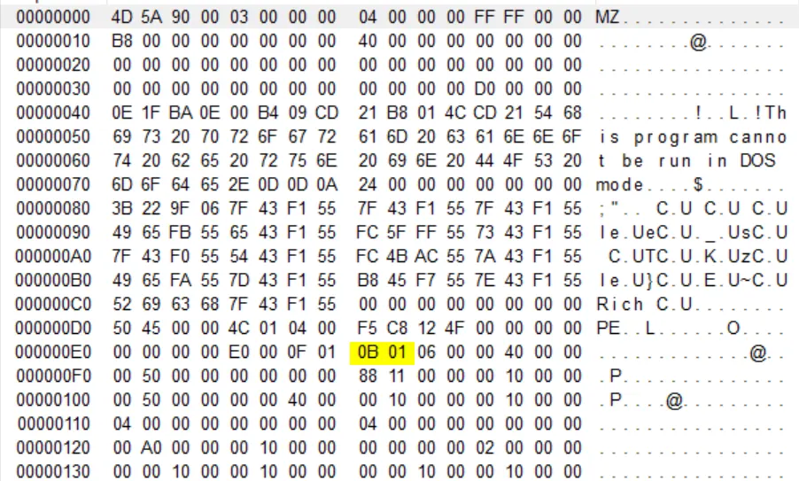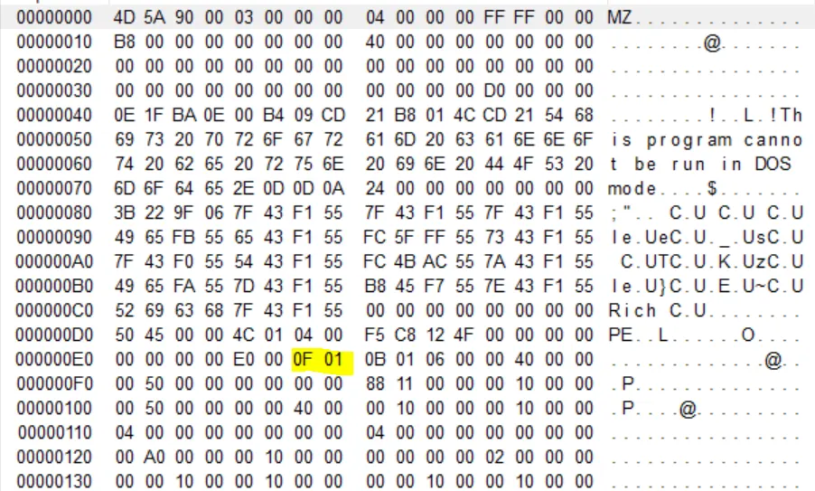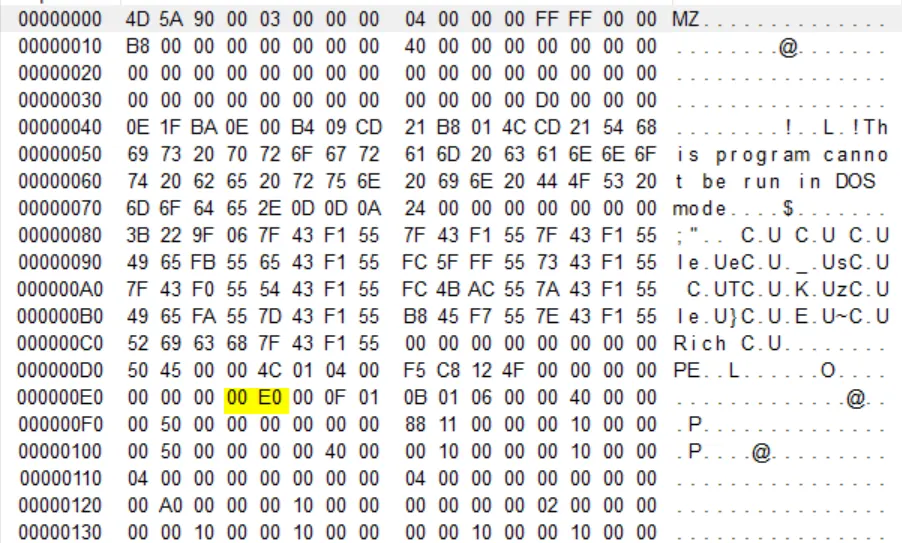 SizeOfOptionalHeader 필드의 값을 확인 할 수 있으며 값은 00E0으로 10진수로는 224바이트 만큼을 차지한다. 이 필드의 값은 32비트에선 0xE0, 64비트에서는 0xF0의 크기를 지닌다.