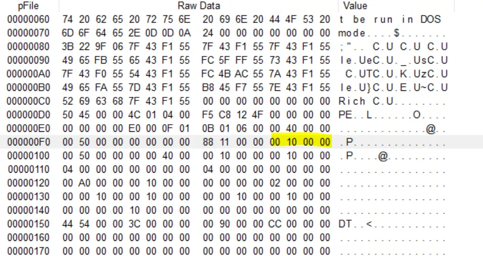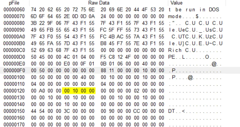 파일 상에서의 해당 섹션이 시작하는 위치(파일 오프셋)를 담고 있다. 이 값 역시도 Optional Header 구조체의 FileAlignment 값의 배수가 되어야 하며, 위 그림에서 SizeOfRawData 필드 다음부터 4바이트를 읽게 되면 00 10 00 00으로, 이는 00001000(0x1000)이 된다.