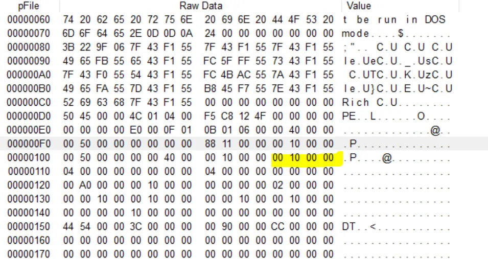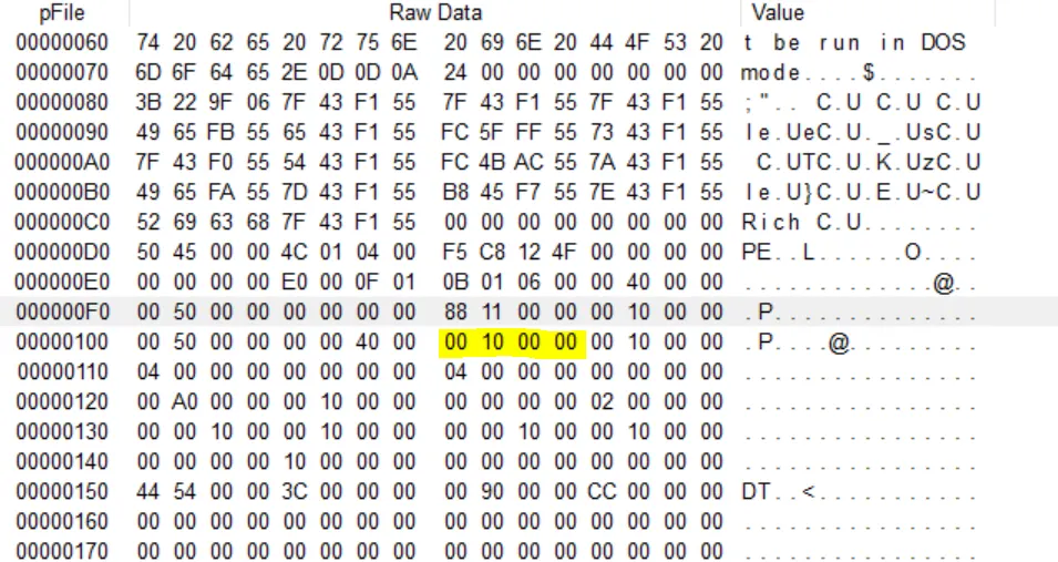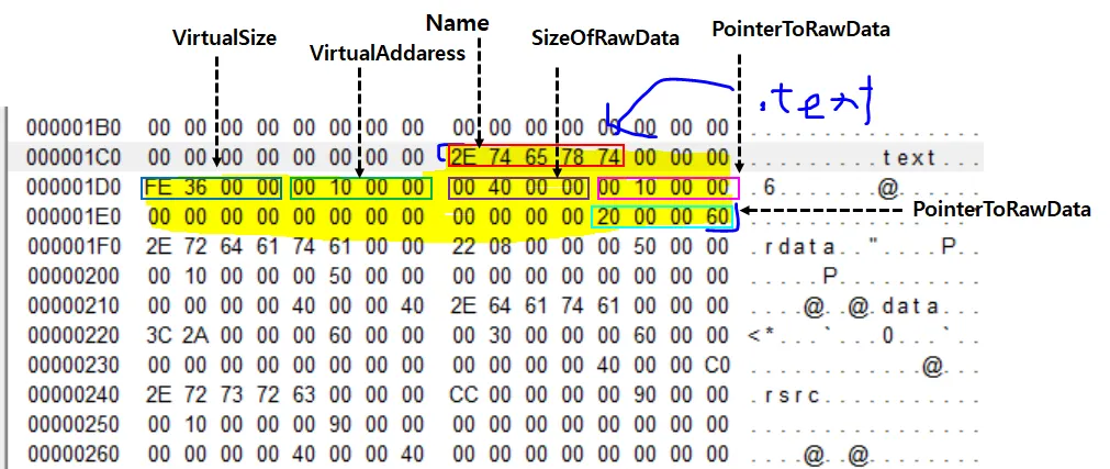 즉 ImageBase + VirtualAddress는 해당 섹션의 실제 주소값이라고 할 수 있다. 위 그림에서 VirtualSize 필드 다음부터 4바이트를 읽게 되면 00 10 00 00으로, 이는 00001000(0x1000)의 값이 된다.