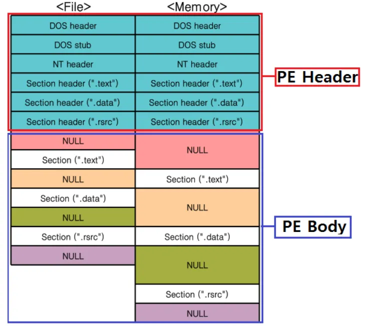 PE파일은 크게 PE 헤더와 PE바디로 구성된다. PE 헤더는 파일을 실행하기 위한 전반적인 정보가 구조체 형식으로 저장되어 있고, PE 바디부분에는 파일의 실제 코드, 데이터, 리소스 등의 내용들이 존재한다.