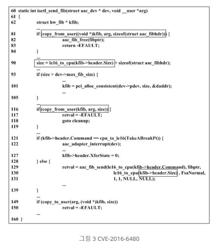 위 코드는 CVE-2016-6480 으로 linux Adaptec RAID 컨틀롤러 드라이버 파일 코드이다. ioctl_send_fib() 함수는 arg가 가리키는 유저 영역의 데이터를 copy_from_user 함수를 2번 이용하여 커널로 가져온다. 처음 가져올땐 특정 버퍼 크기 계싼, 데이터 유효성 체크 등을 수행한다. 두번째 가져올때 첫번째에 계산된 결과에 따라 버퍼를 할당한다.