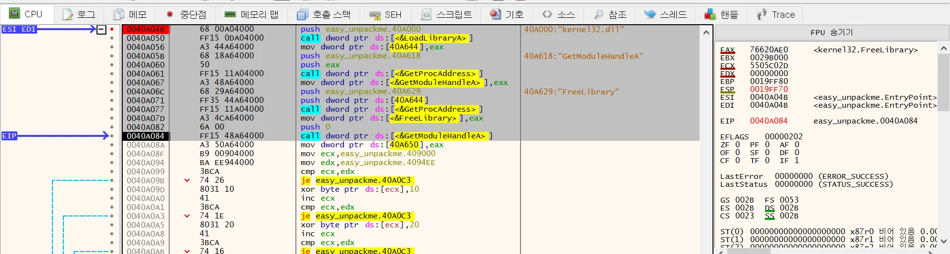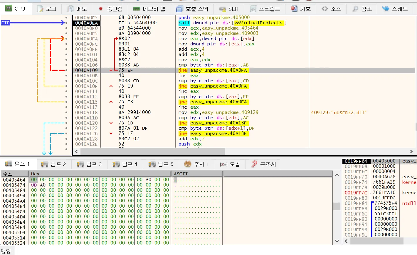 코드영역과 데이터 영역을 복구한 이후에 OEP로 EIP를 돌린다.