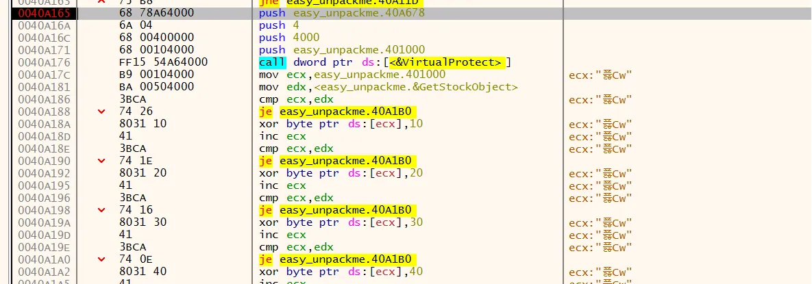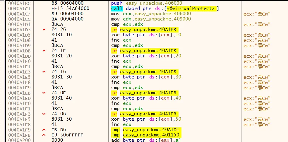 그 다음을 보면 0x401000 부터 0x405000 까지의 권한을 다시 설정 즉 복구를 진행하는데, 해당 영역은 .text 영역인걸 알수있다.