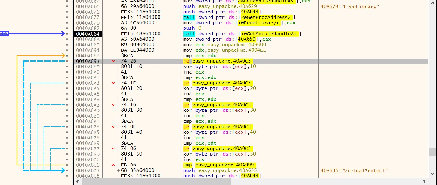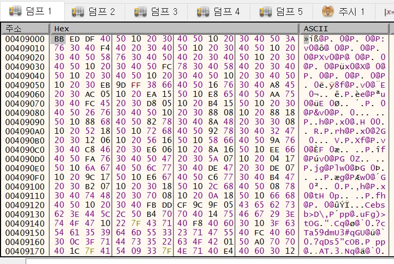 그다음 0x409000 주소부터 한바이트씩 xor 연산을 하며 0x4094ee 의 값과 비교를 한다.