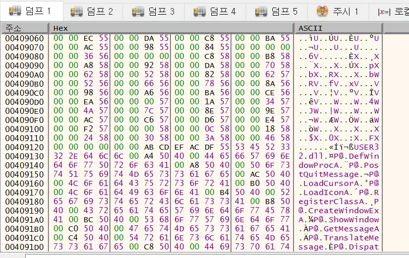 아스키 값을 잘 보면 함수 이름들이 보인다. 아마 .Gogi 섹션에 필요 함수들을 패킹해서 못보게 해논것 같다. 그럼 이제 분명 해당 영역을 뒤에서 사용할 것이다. 일단 마저 분석해보자.