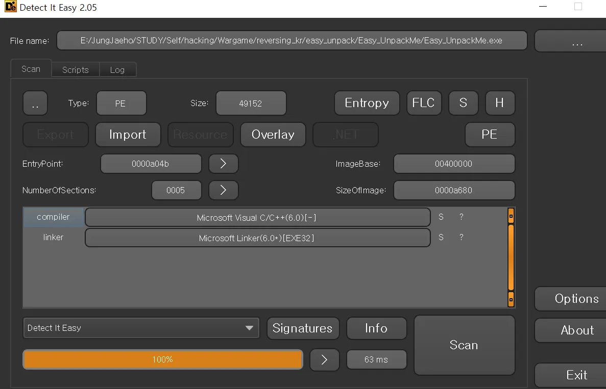 우선 die 에 넣어서 간단한 확인을 해봤다. 엔트리 포인가 0x40a04b 로 보인다. 아마 저 부분부터 타고 들어가서 언팩하는 로직을 찾아야 할것같다
