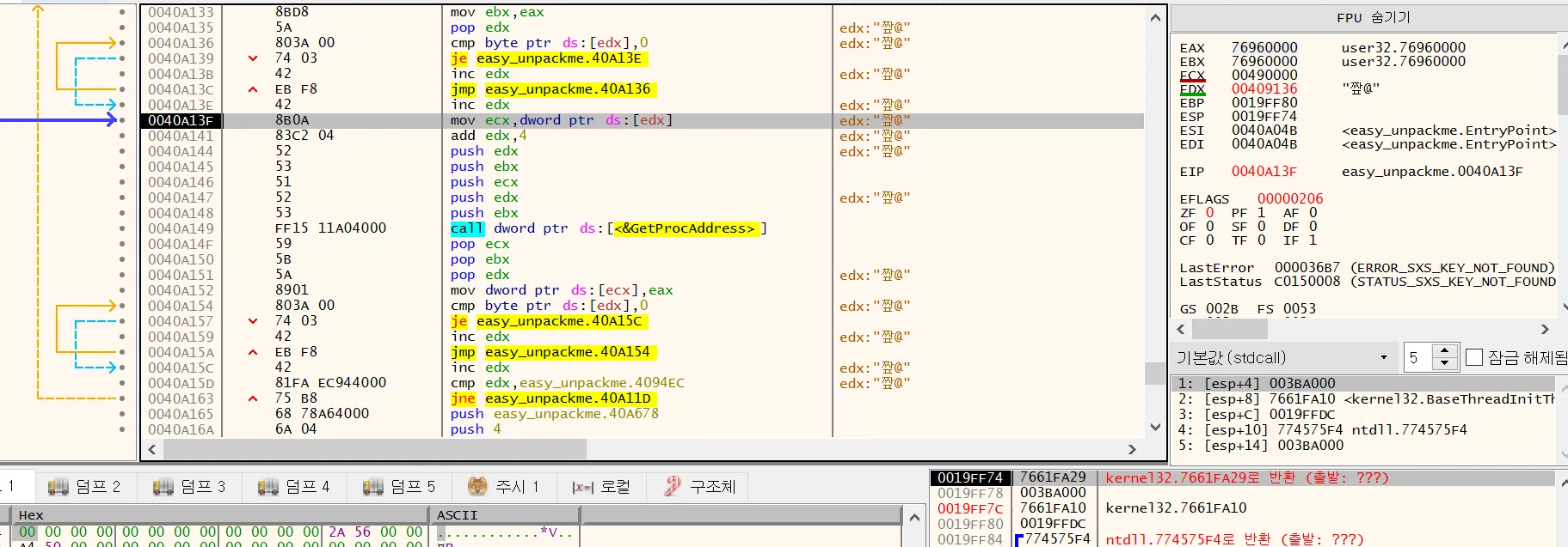 edx에 들어있는 함수이름을 가져와서 getprocadress()를 통해 함수 주소를 구한다. edx는 0x409136 영역이고 해당 영역은 위에서 xor 연산을 통해 복구시킨 .Gogi 섹션이다.