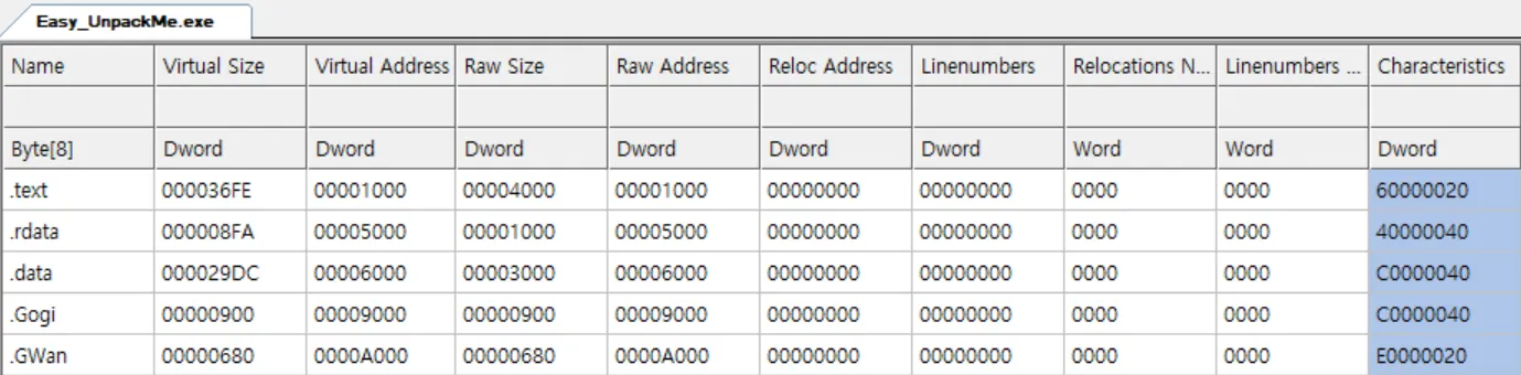 0x409000 영역은 .Gogi 라는 section이다. 해당 섹션에는 현재 다음과 같은 값이 들어가 있다