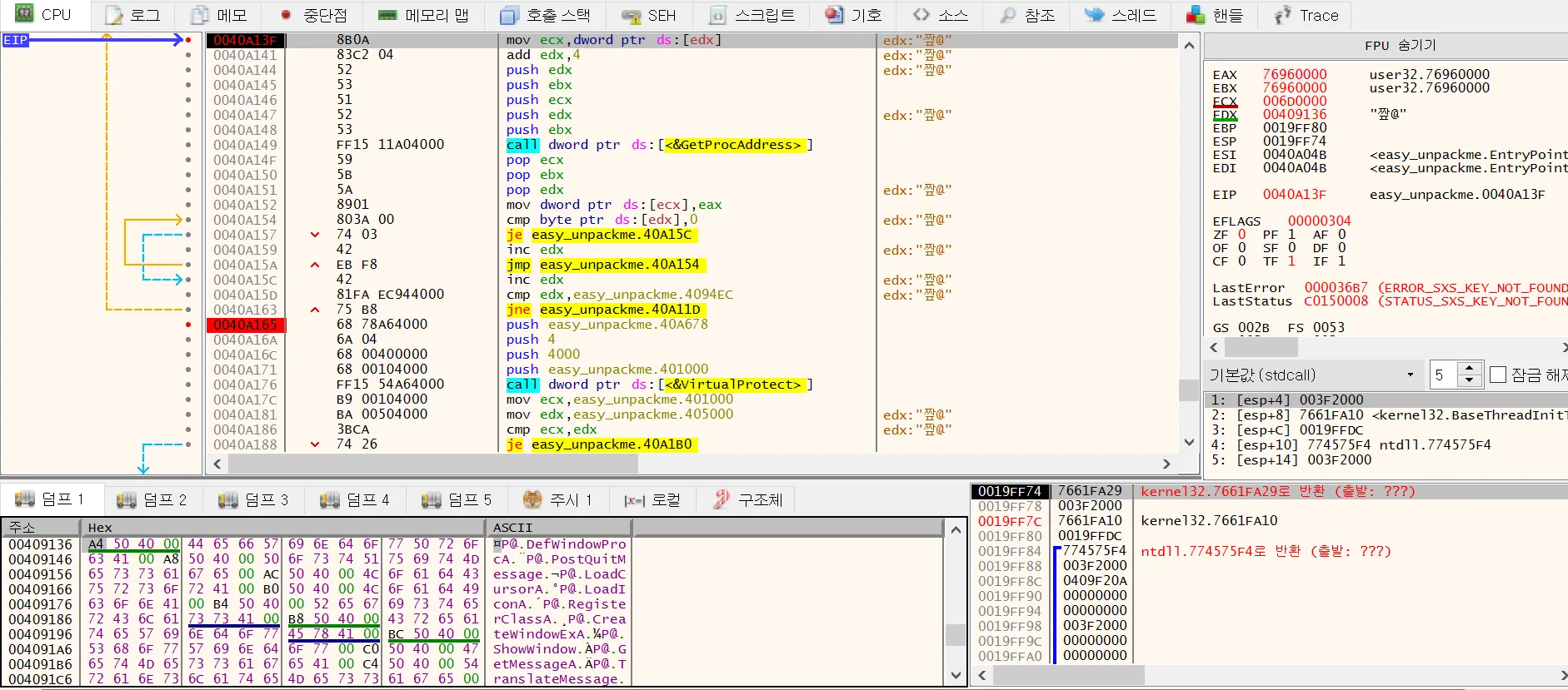 여기가 바로 모든 언팩과정을 거치고 실제 실행되는 oep 위치이다.