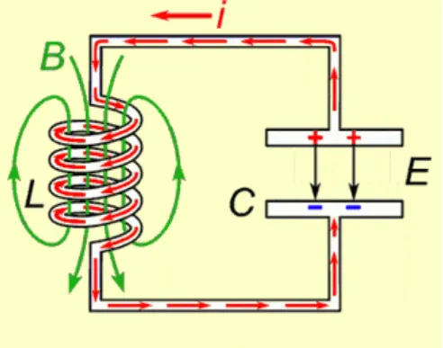 이제 전자가 코일을 다 통과하여 다시 커패시터로 완충이 된다면 커패시터 내부의 전기장의 세기가 MAX가 되고 코일의 자기장의 세기는 0이된다.