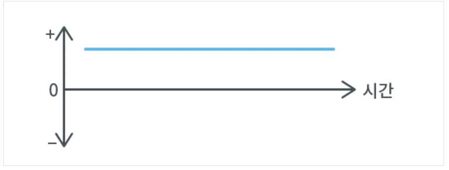 위 사진 처럼 AC는 시간에 따라서 극성이 주기적으로 바뀐다. 반대로 DC는 시간에 따라 흐르는 극성도 크기도 변하지 않는 전류를 일컫는다. 교류의 경우 우리가 가정에서 사용하는 TV, 냉장고 등의 전원이며 플러그의 두 선 중 한 번은 왼쪽 선에서 오른쪽으로, 또 한 번은 오른쪽에서 왼쪽으로 전류의 흐름이 수시로 변하게 된다.