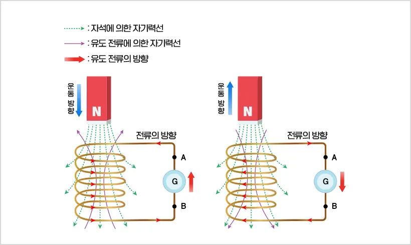 페러데이 법칙은 자기장이 변하면 기전력이 발생한다! 를 의미한다. 렌치의 법칙은 이 기전력이 어디로 발생하냐를 설명한다. 렌치의 법칙에 따르면 자석의 움직임을 방해하는 방향으로 유도기전력이 발생한다. 위 그림을 보면 자석이 들어오는 방향에 저항하는 방향으로 자기장을 형성하기 위해 유도된 전류 즉 유도기전력이 반시계 방향으로 생긴다.