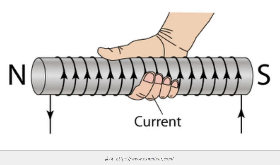 앙페르의 법칙은 전류가 도선을 흐를 때 자기장이 발생한다는 원리이다. 위 사진을 보면 화살표 방향으로 전류가 흐른다면 왼쪽으로 자기장이 형성된다. 이를 쉽게 이해하려면 솔레노이드를 감싸고 있는 손가락의 방향이 전류의 방향이고, 엄지 손가락이 이에 생성되는 자기장의 방향으로 이해하면 된다. (오른손의 법칙)