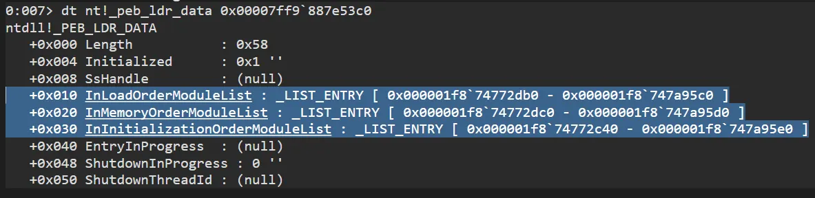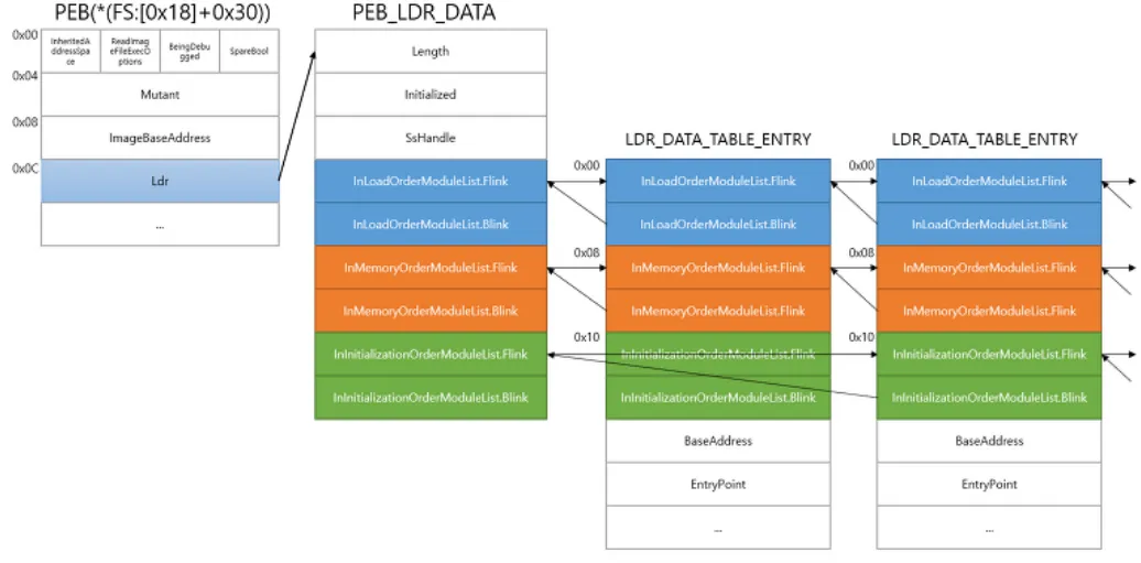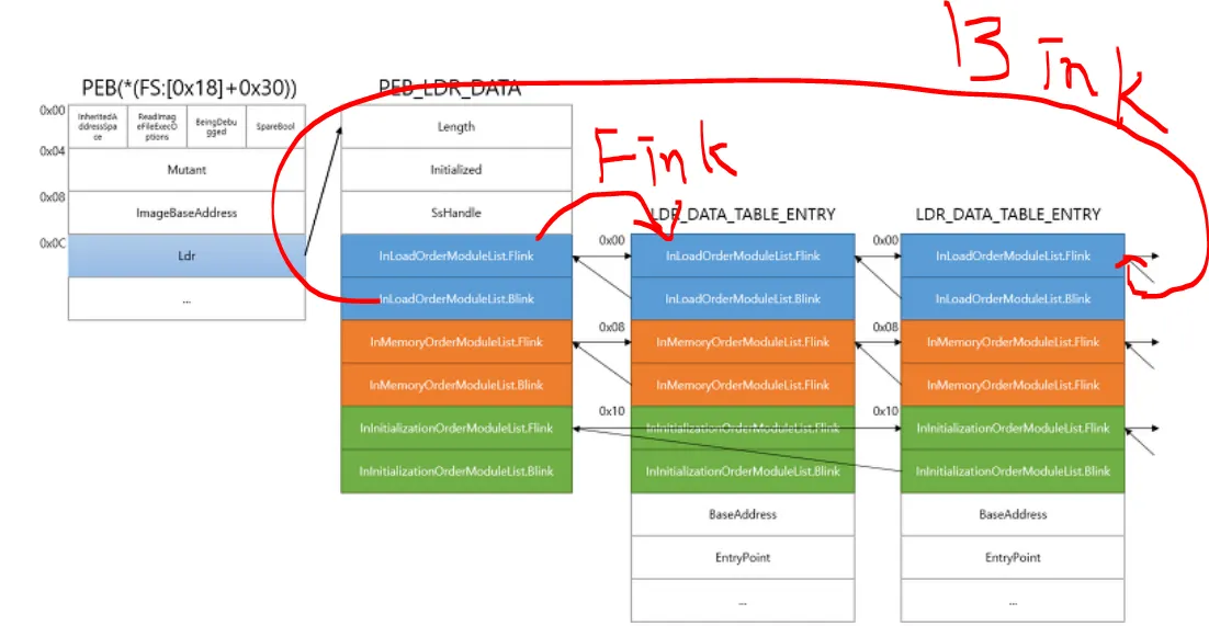 사진을 보면 각 모듈들의 정보가 담긴 LDR_DATA_TABLE_ENTRY 가 더블 링크드리스트로 서로서로를 가리키고 있는 것을 볼 수 있다. 이러한 LDR_DATA_TABLE_ENTRY을 가리키고 있는 포인터가 바로 PEB_LDR_DATA 구조체에 저장되어있는 InLoadOrderModulList, InMemoryOrderModulList, InInitalizationOrderMoulduleLIst 이다.