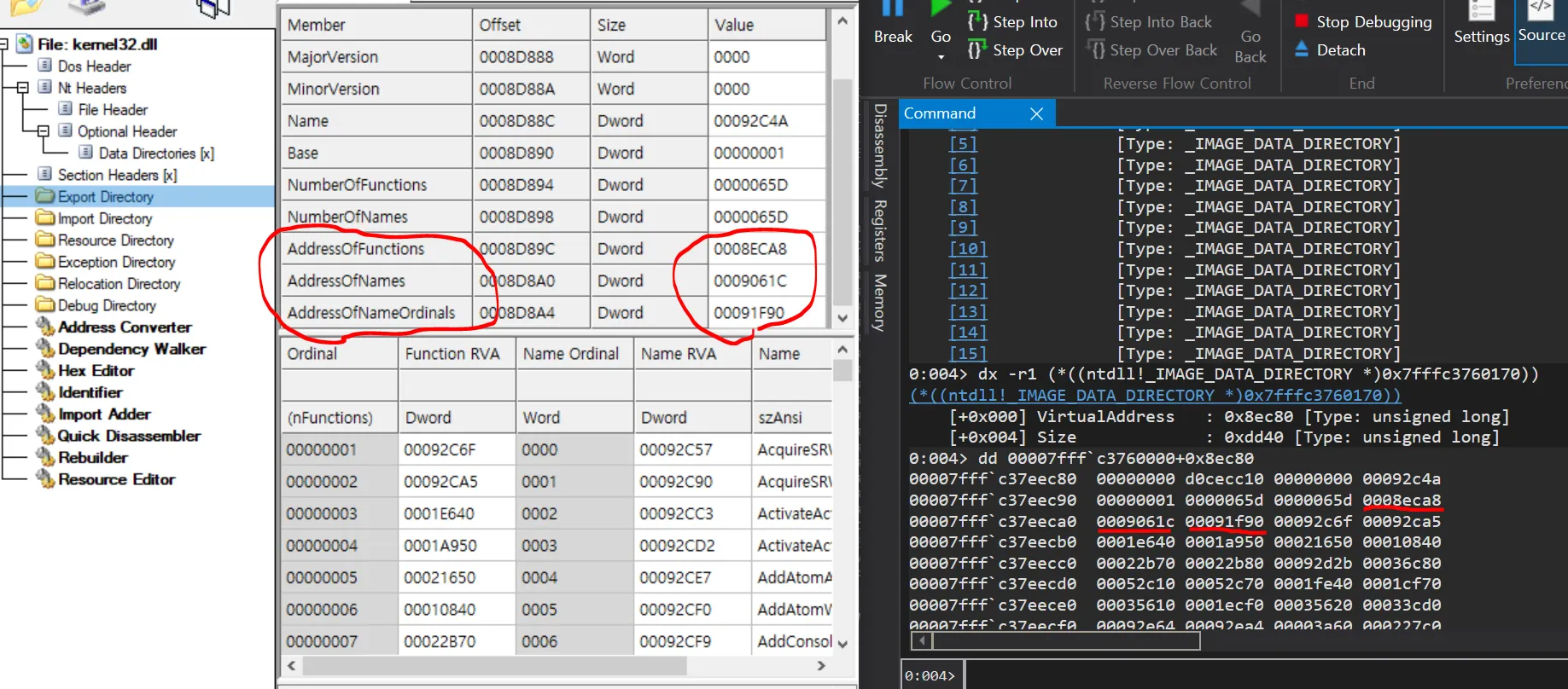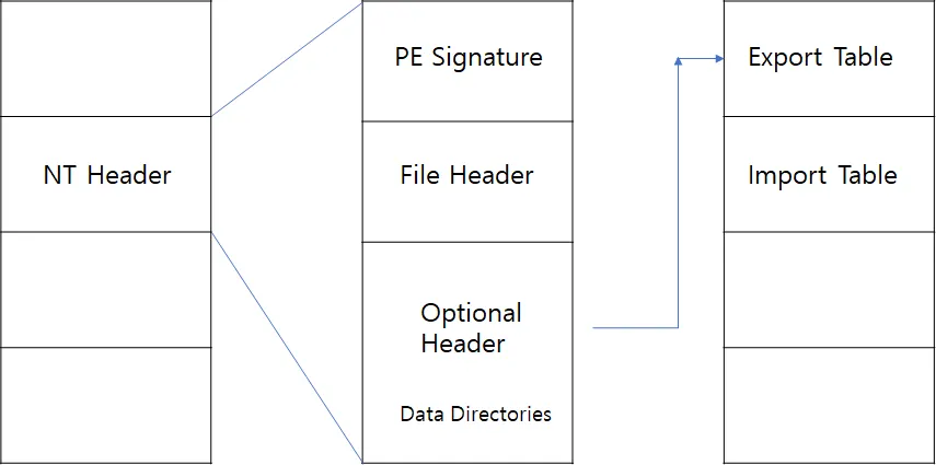 DLL은 자신이 어떤 함수들을 Export하고 있는지에 대한 정보를 PE 헤더에 저장하고 있으며, 이 정보는 PE헤더 IMAGE_OPTIONAL_HEADER64(32bit는 32)의 DataDirectory 배열의 첫 번째 구조체인 Export Directory에 저장되어 있다