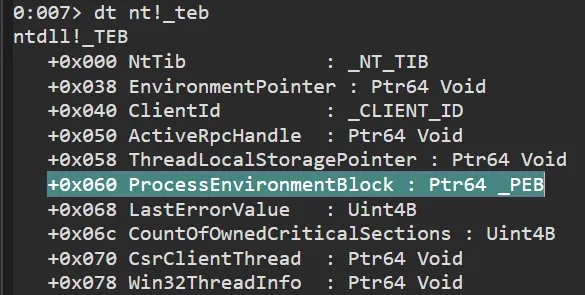 64bit 환경에서 TEB 구조체에 저장된 PEB 주소