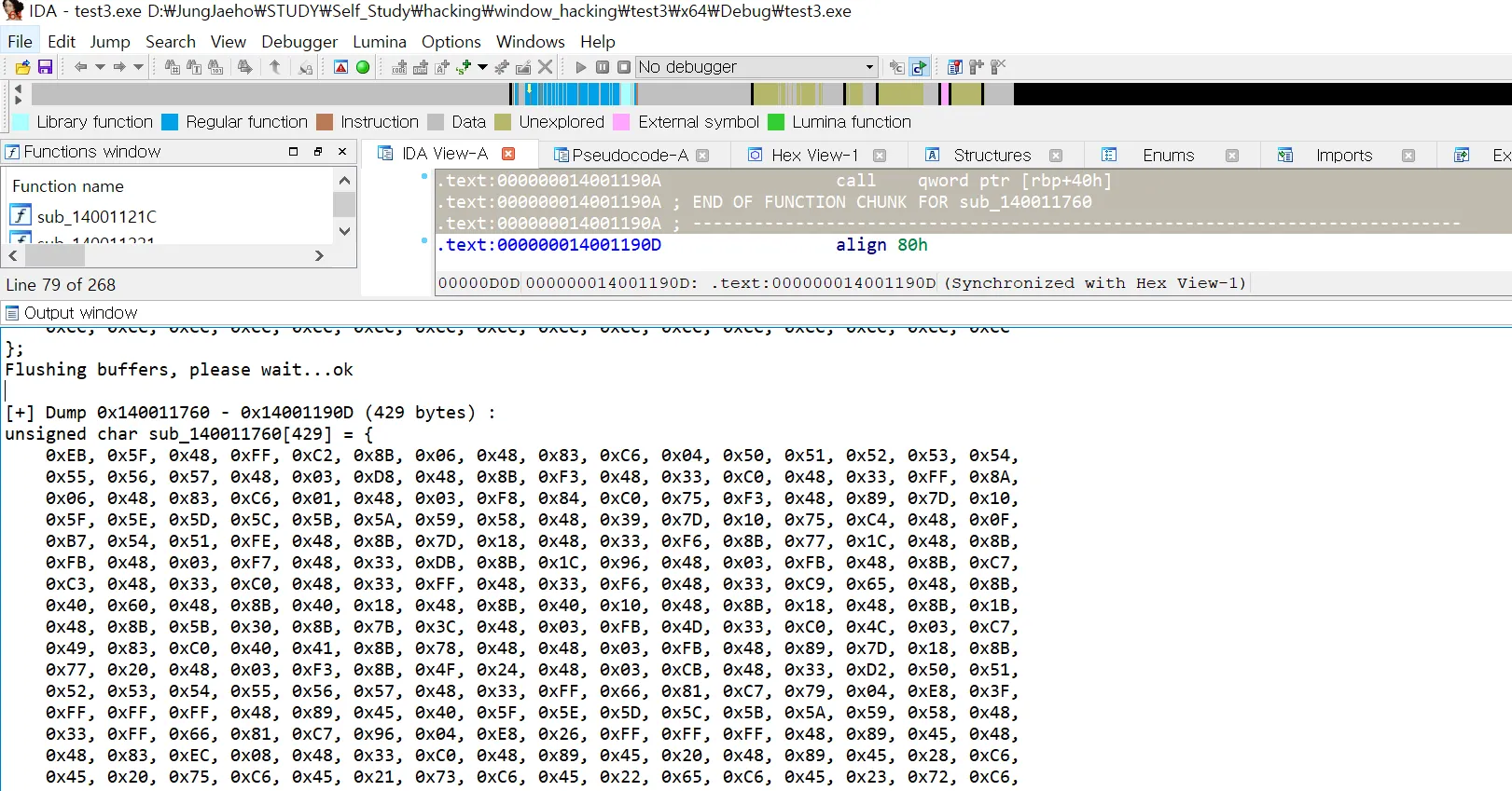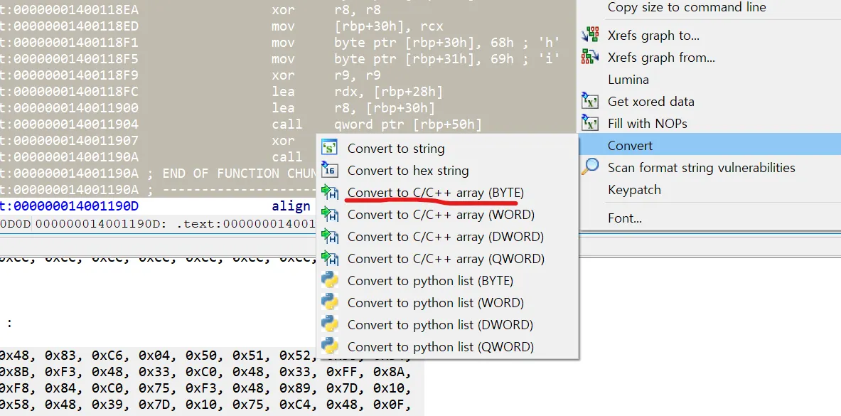 이제 바이트 코드를 추출하여 쉘코드를 완성해보자. 해당 쉘코드는 너무 길어 visual studio의 디스어셈블러에서 바이트코드를 추출하기는 애매하다. 따라서 아이다의 LazyIda 플러그인을 이용하여 배열 형태로 바이트코드를 추출하였다. 아이다에서 쉘코드 영역을 드래그한 후