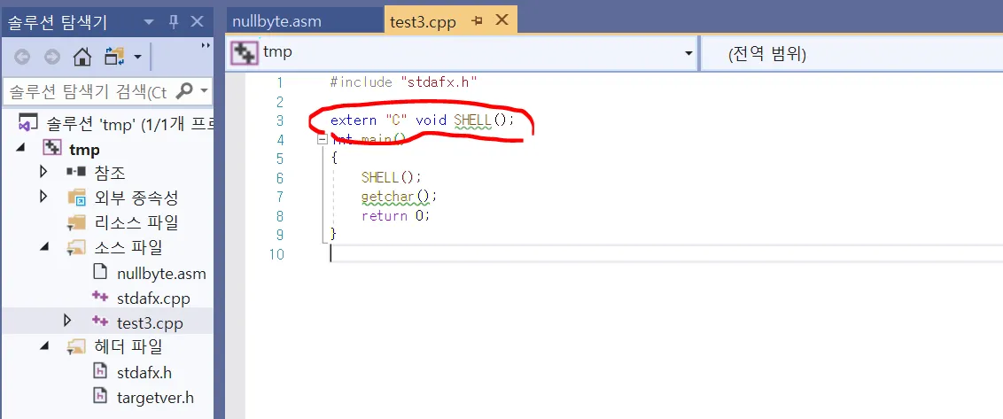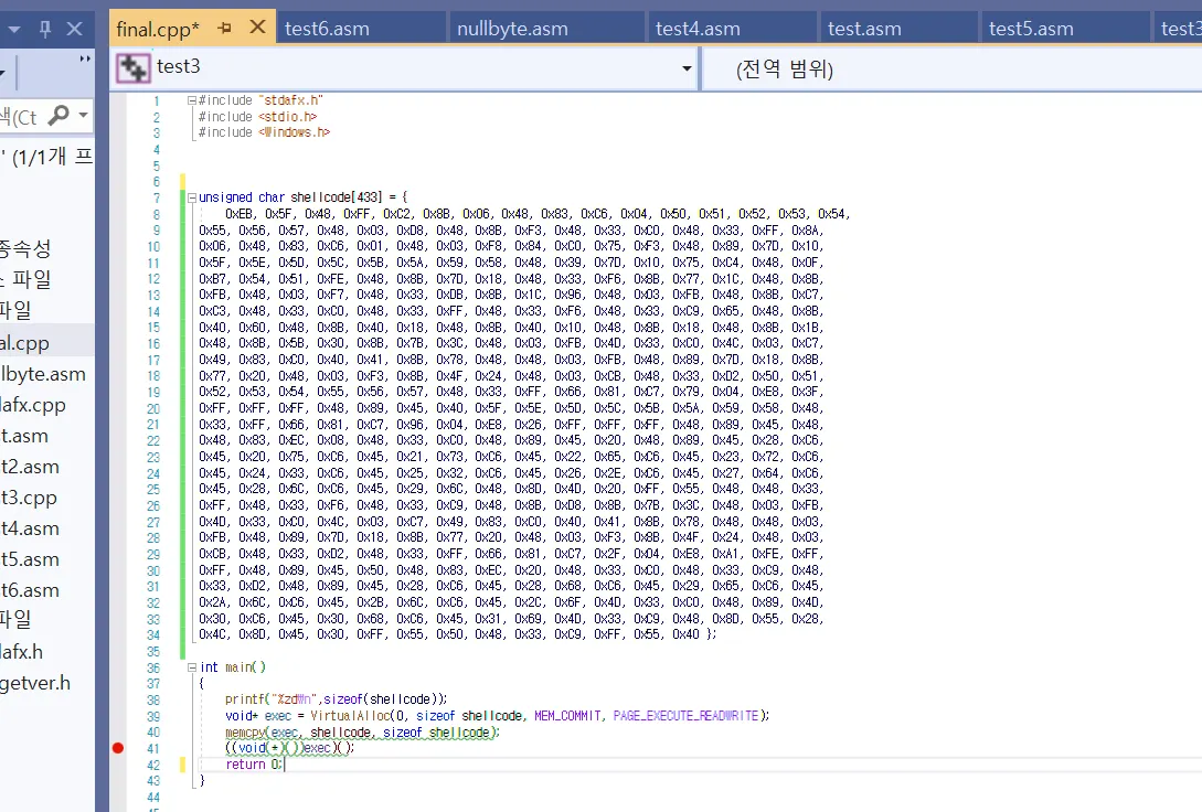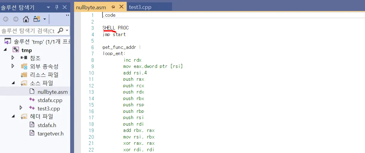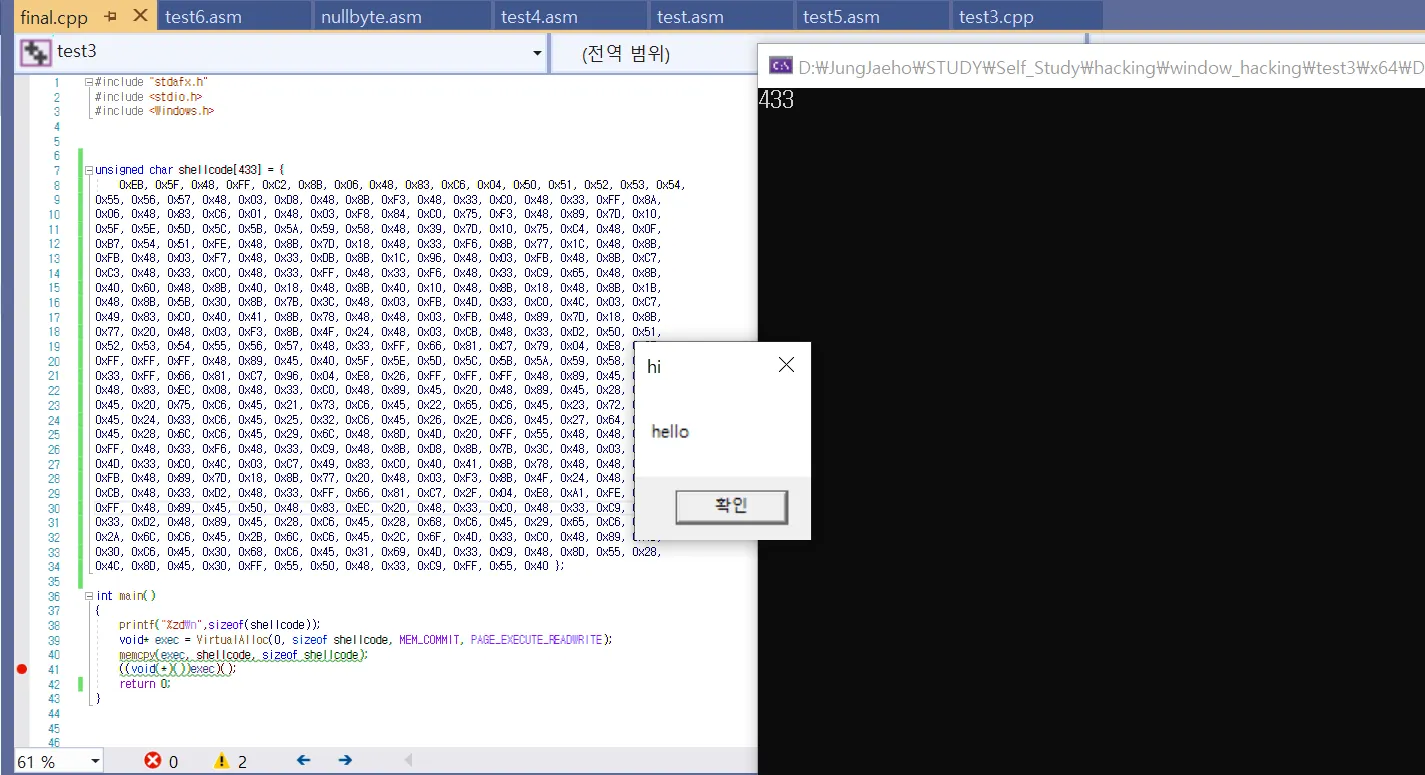 32bit 환경으로 책에 나온 예제를 1차적으로 공부하여 부족한 부분을 공부하고, 로컬 환경(x64)에서 실제 쉘코드 작성을 진행하였다. 32bit에서는 인라인 어셈블리로 작성가능했지만, 64bit에서는 불가능하다. 따라서 masm으로 따로 파일을 만들어서 cpp 파일에 링킹 시키는 과정으로 작성해야한다