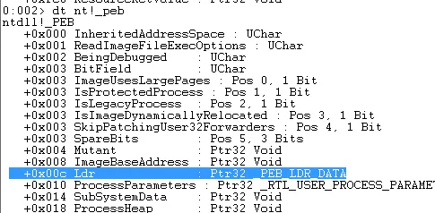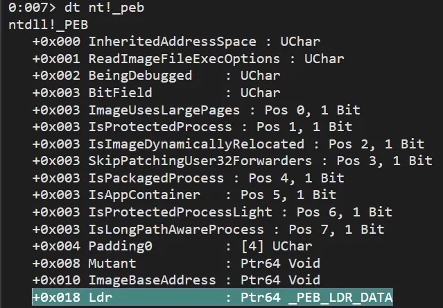 Ldr 멤벼변수의 위치 역시 32bit에서는 0xc 위치이고, 64bit에서는 0x18 위치로 차이가 있다. 요약해서 말하자면, Ldr이란 프로세스에 로드된 모듈에 대한 정보를 제공하는 PEB_LDR_DATA 구조체를 가리키는 포인터. _PEB_LDR_DATA 구조체를 살펴보자