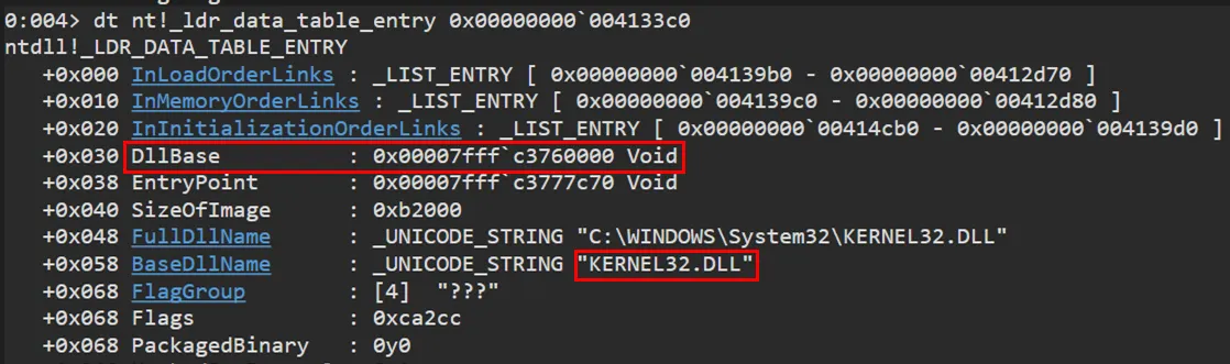 따라서 이 더블 링크드리스트를 순회하여 원하는 dll을 확인 가능하고, 해당 구조체에서 DLLbase 주소 즉, DLL의 시작주소를 알 수 있는 것이다. 그렇다면 실제로 kernel32.dll 모듈의 base 주소를 확인 해보자.