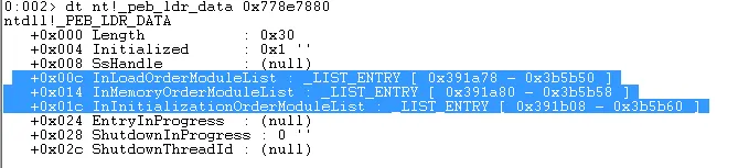 InLoadOrderModulList, InMemoryOrderModulList, InInitalizationOrderMoulduleLIst 는 각각 모듈의 로드된 순서, 메모리에 매핑된 순서, 초기화된 순서대로 각각 다른 더블링크드 리스트 형태로 구성되어 있다.