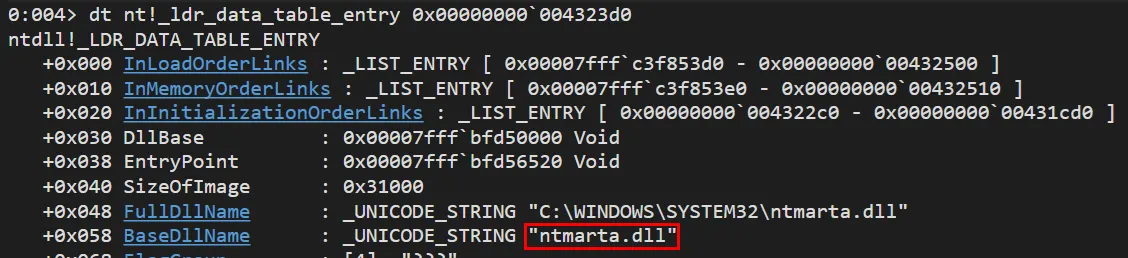 해당 blink는 "ntmarta.dll" 모듈에 대한 LDR_DATA_TABLE_ENTRY 정보를 담고 있었다. 결론적이로 해당 모듈은 Flink를 따라가면서 마지막에 로드된 모듈이다. 해당 모듈이 나오고 다시 test3.exe가 나오는 것을 확인하였다.