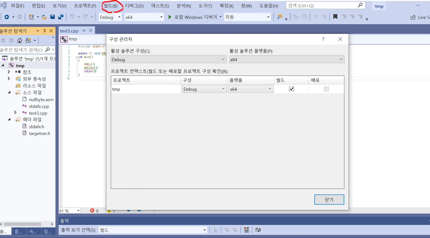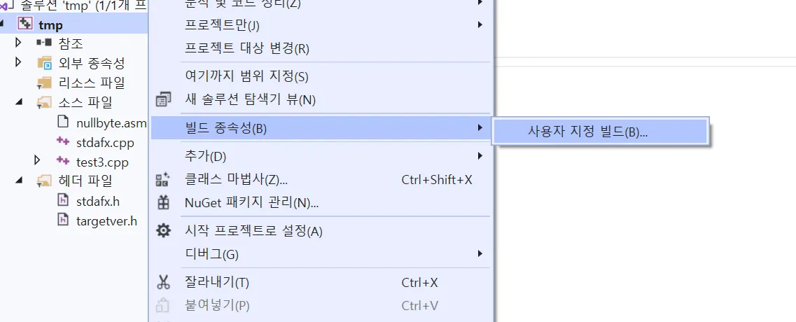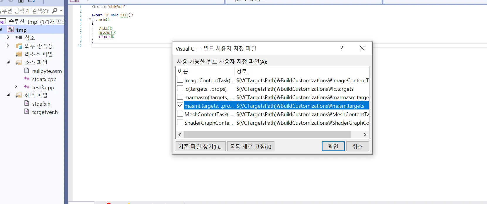 프로젝트 우클릭 - 빌드 종속성 - 사용자 지정 빌드 - masm 체크