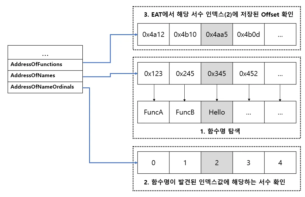 간략하게 함수 주소를 구하는 과정을 설명하면 다음과 같다. 우선 Export Directory에서 AddressOfNames 부분을 뒤져서 원하는 함수를 찾는다. 여기서 원하는 함수명을 Hello라고 하자.