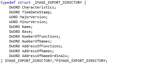 Image_optional_header의 DataDirectory 배열의 첫 번째 구조체인 Export Table은 IMAGE_EXPORT_DIRECTORY 구조체로 저장되어 있으며 아래와 같이 구성된다
