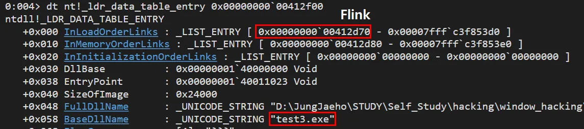 근데 여기서 궁금한 점이 생겼다. peb_ldr_data 구조체에서 Inorder.. 리스트의 Flink는 실행파일 그 자체에 대한 정보가 처음 리스트의 정보로 나온다고 했는데 그럼 Blink에는 무엇이 있을까라는 의문점이 들었다. 그래서 직접 한번 값을 찍어보았다.