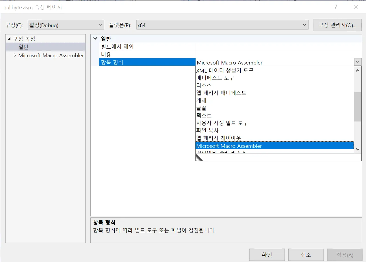이름.asm 파일 생성 - 해당 파일 우클릭 - 사진처럼 설정