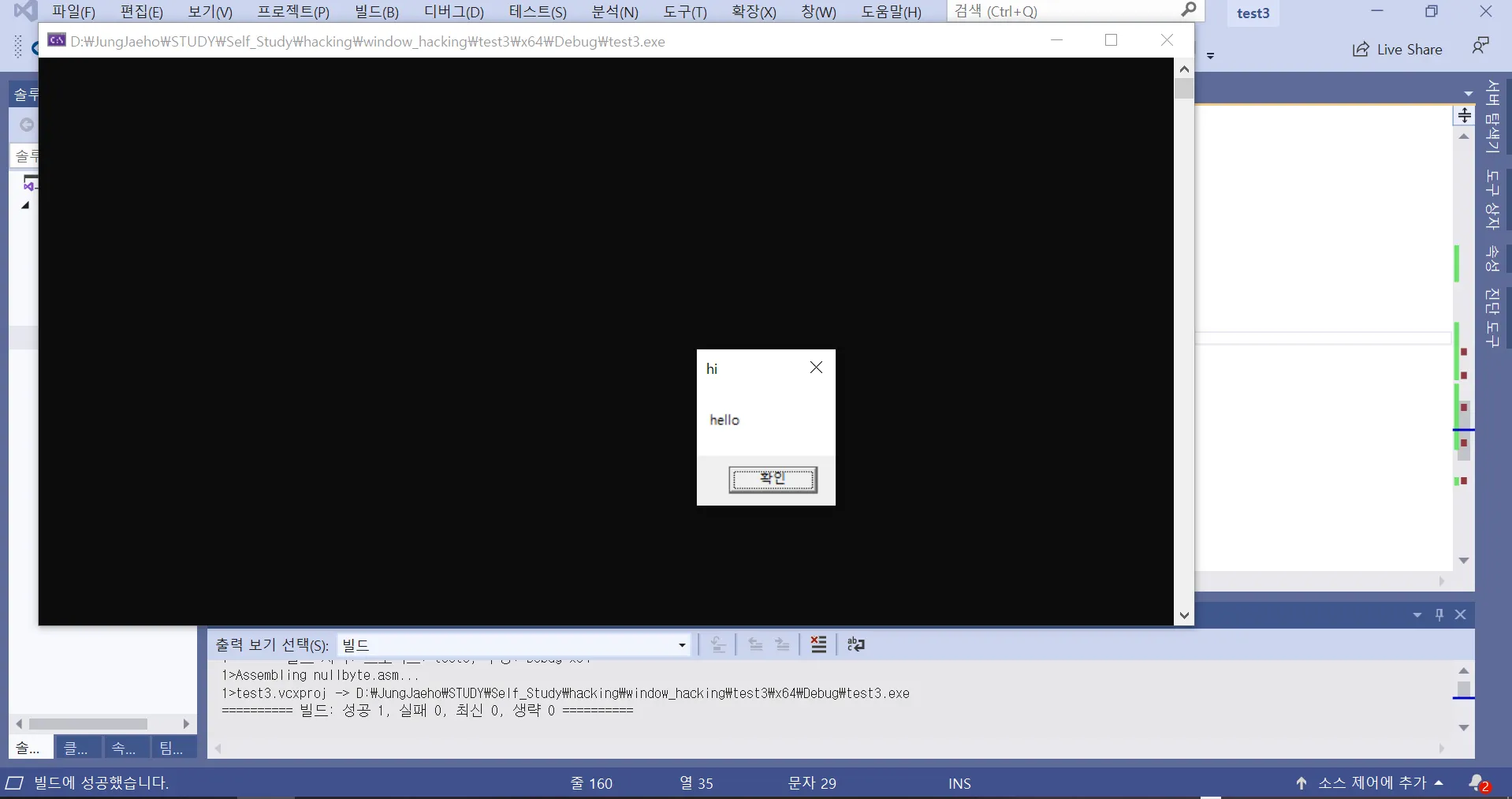 추가적으로 책에서는 WinExe 함수를 이용하여 cmd창을 띄우는 과정을 설명하였지만, 이를 응용하여 x64 환경에서 MessageBoxA를 띄우는 것을 이번 목표로 세웠다.