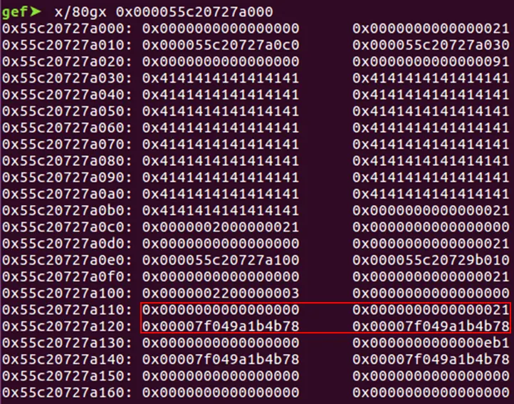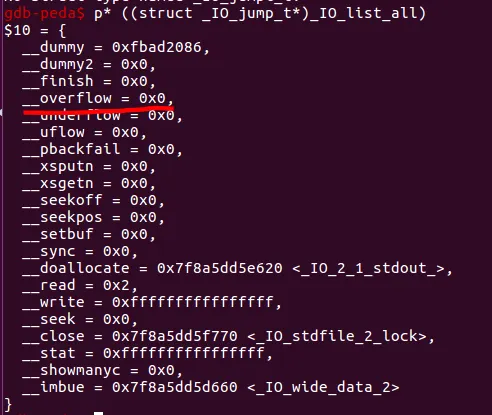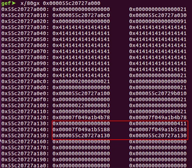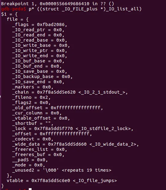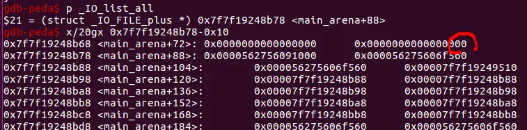 현재 _IO_list_all 구조체가 저렇게 변경된 것을 확인할 수 있다. main_arena_88 주소를 기준으로 싹다 변경되었다.