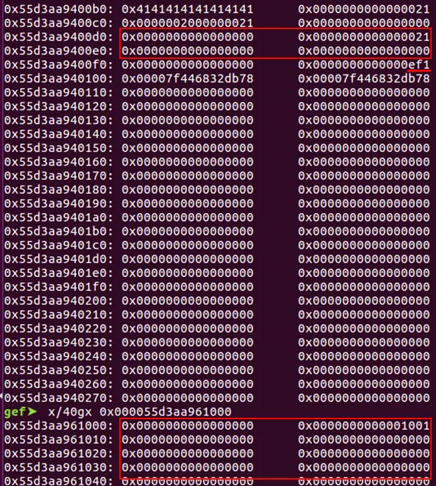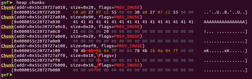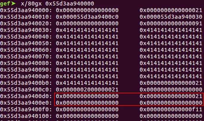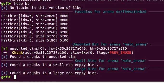 현재 우리가 size 영역을 0x61로 변경하였기 때문에 small bin 영역으로 해당 unsorted bin에 들어있는 청크가 빠지게 된다. 참고로 small bin도 fastbin chunk size를 포함하기 때문에 전혀 잘못된게 아니다.