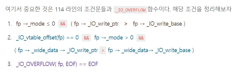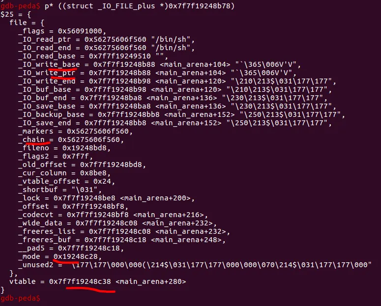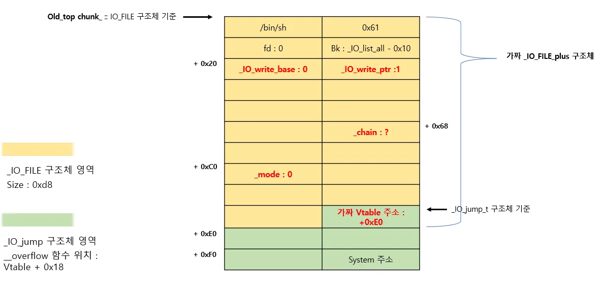 내부적으로 old_top 청크 주소 값을 _IO_list_all 구조체 변수로 인식하여 로직이 수행되고, 최종적으로 vtable에서 +0x18 의 위치에 있는 system 함수를 실행하게 되는 것이다.