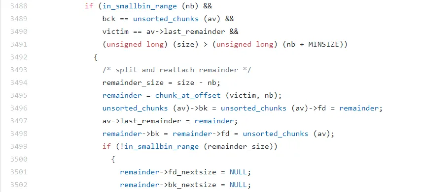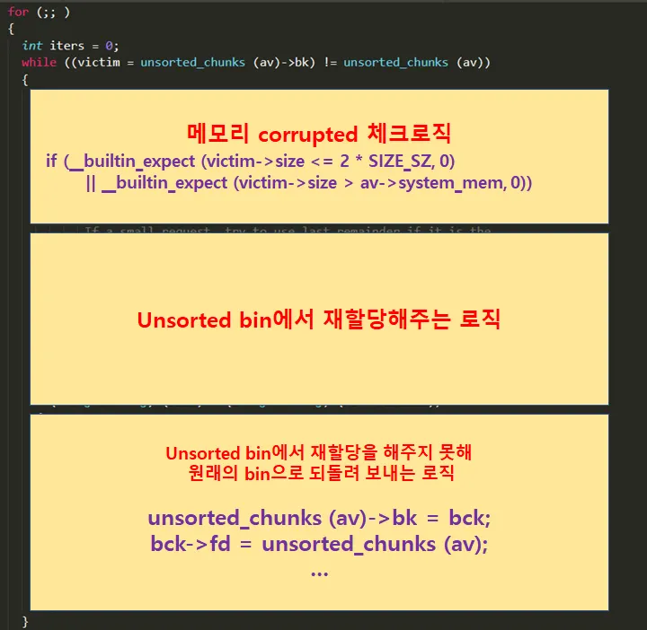 _int_malloc 함수의 코드의 일부를 살펴봐야한다. 위 로직은 unsorted bin scan을 하는 부분이다. 현재 unsorted bin에 청크가 존재하고, 유일한 하나의 청크이고, last_remainder이며 사이즈가 최소사이즈보다 크다면 unsorted bin에서 바로 재할당을 해준다. 만약 조건에 만족하지 못하면, 현재 unsorted bin을 제거하여 원래 자신의 bin에 들어가게 된다.