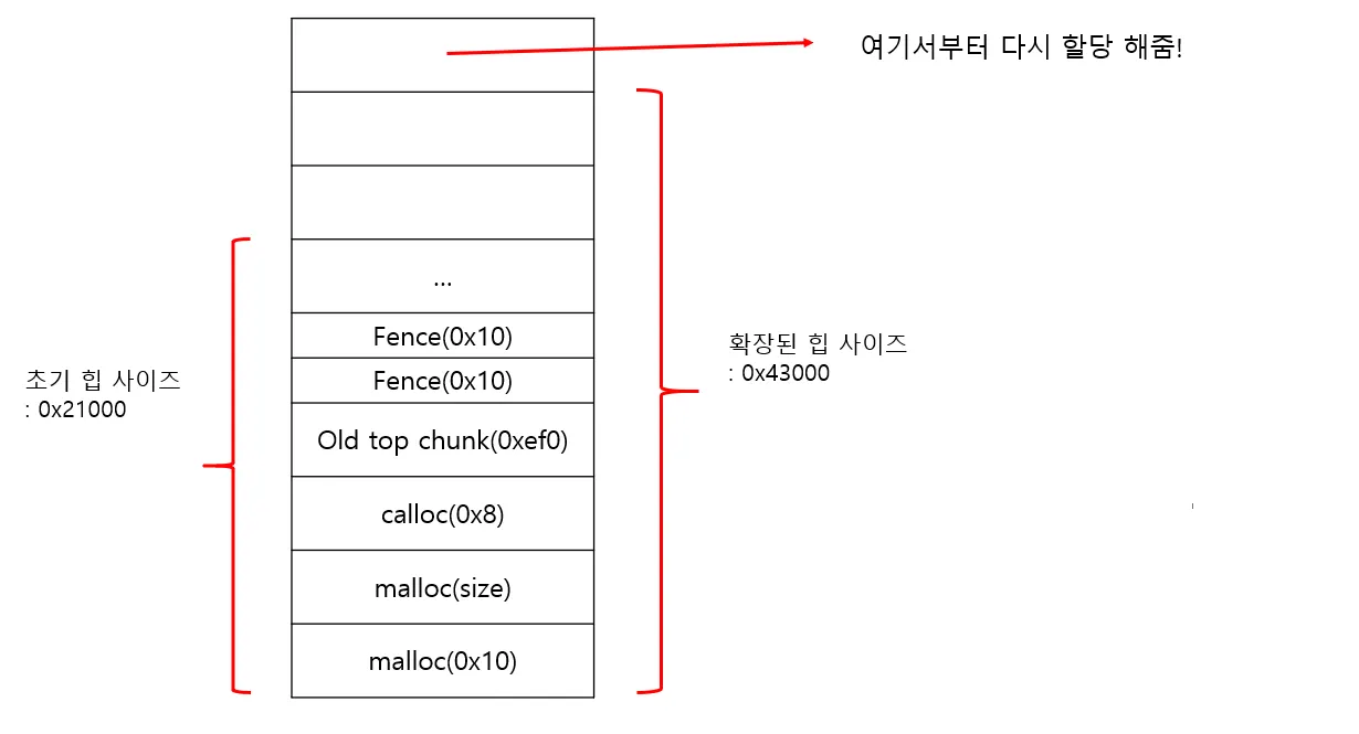 첫번째 malloc(0x10)시 위 사진에서 마지막 네모칸의 로직이 수행된다. 첫 반복문에서 메모리 체크로직을 통과하는 이유는 처음 victim 변수에는 old_topchunk 주소가 들어가 있어 정상적인 체크로직을 통과하게 된다.