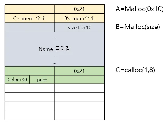 처음 malloc(0x10)은 heap정보를 관리하는 용도이다. 이름을 입력받는 청크주소와 색깔,가격을 입력받는 청크의 주소가 들어간다
