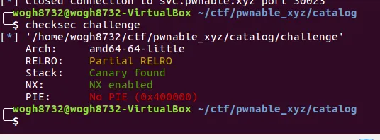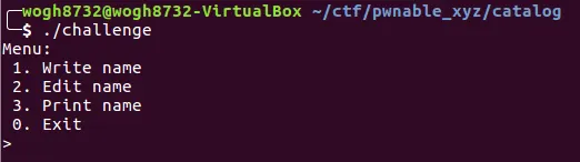 catalog는 bss 영역에 선언된 변수이다. 초기에 0x30 크기만큼 malloc으로 힙영역을 할당받는다. 그리고 catalog 배열에 할당받은 청크주소를 저장하고, mem 영역 맨 마지막 부분에 0x20과 print_name 함수 포인터를 넣는다.