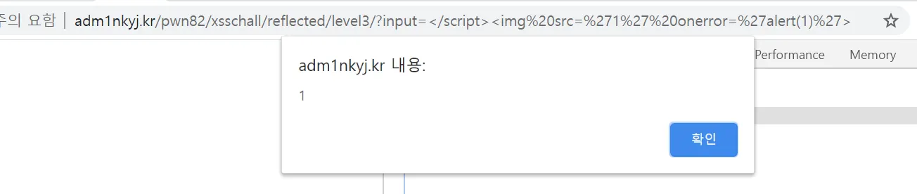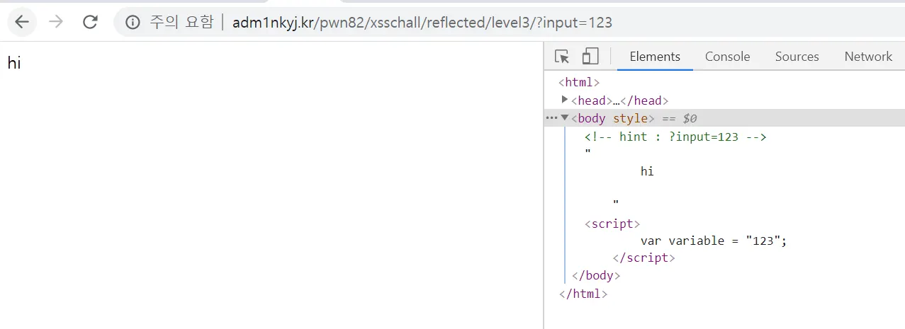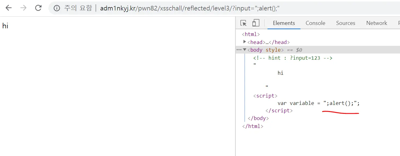 하지만 현재 3번 문제에서는 " 요거를 없애는 필터링이 걸려있기 때문에 해당 페이로드가 안먹혔다. 그렇다면 저거를 우회하는 방법을 생각해야하는데 꺽쇠가 3번에는 필터링이 안되므로 이를 이용하면 된다.