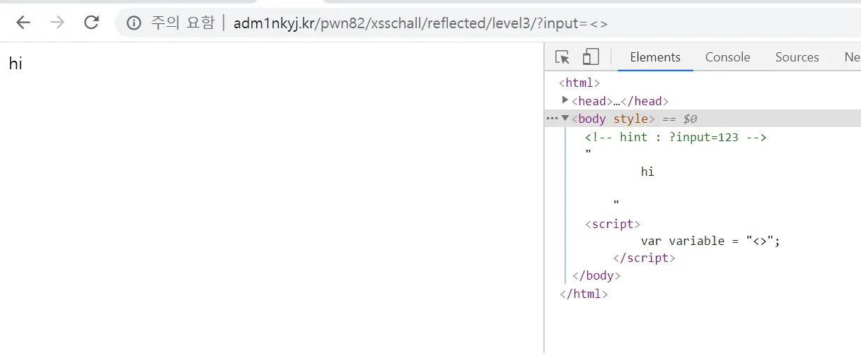 근데 <> 요 꺽쇠가 필터링이 되지 않는다. 2번문제에서는 <> 저 꺽쇠가 필터링이 되었다. 하지만 이미 스크립트 태그안에 입력값이 들어감으로 쓸필요가 없었다.