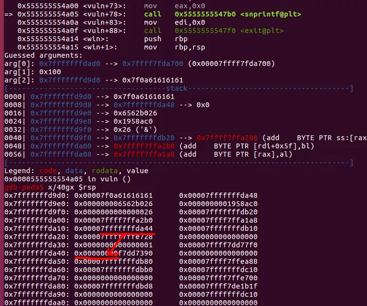 snprintf 안으로 들어가면 실제 vsnprintf에서 fsb가 발생하고, 해당 함수가 호출되면, 저 빨간줄친 돌아갈 주소가