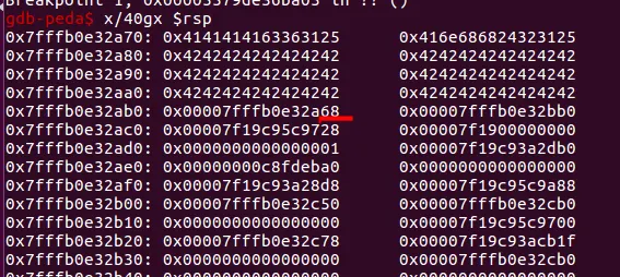 그렇다면 fsb를 이용하여 저기 주소 하위 한바이트를 0x14로 변경하면 된다. 하지만 0x7ff..d9c8을 가리키고 있는 주소는 현재 스택에 없다. 없으면 만들어 주면된다.